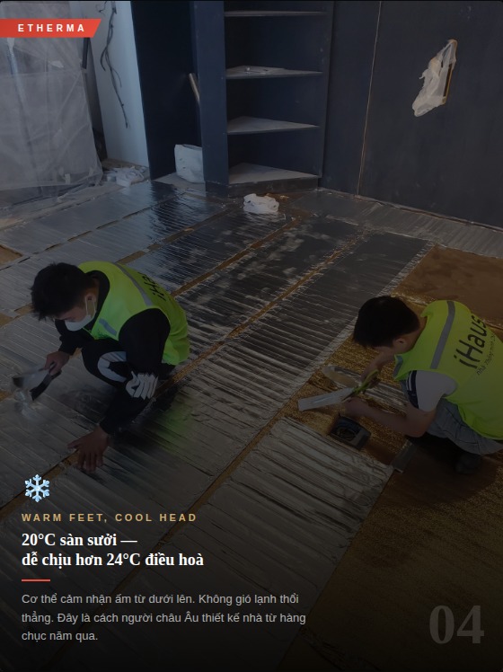 Kết quả: bề mặt luôn khô ráo, hơi nước không có chỗ ngưng tụ. Sàn gỗ không vênh. Tường không bong sơn. Và kỳ lạ thay — 20°C với sàn sưởi còn dễ chịu hơn 24°C với điều hòa thổi thẳng vào người.